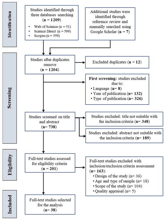 A total of 1209 records were identified through the search utilizing the chosen databases. A manual search of the reference lists of the selected full-text papers and Google Scholar added seven (n = 7) additional articles. After removing duplicate studies and including only peer-reviewed journal articles published in the English language from 2014 to 2024, a total of (n = 738) papers were retained. However, (n = 348) publications were rejected after title screening, and (n = 189) were declined following abstract screening, as they were considered ineligible due to the unsuitable scope of the studies (n = 422) or the unsuitable sample of the study (n = 115). In the eligibility phase, the two reviewers meticulously examined a total of (n = 201) full-text papers. Of them, (n = 38) full-text articles were included in the thematic and descriptive analysis, while (n = 163) articles were excluded. The grounds for exclusion were as follows: (n = 56) articles were review studies, (n = 18) articles involved samples that were not aged 18 years and above, (n = 84) articles did not include any results on DWPs and consumer acceptance or human interaction, and (n = 5) studies did not meet the required quality standards (NOS total quality score less than 6). The rejected articles were deficient in outcome data, precise exposure identification, appropriate control of confounding variables, or sufficient sample size. Figure 2 presents a PRISMA flowchart that delineates the selection procedure. The outcomes were synthesized and analyzed following the five identified themes.