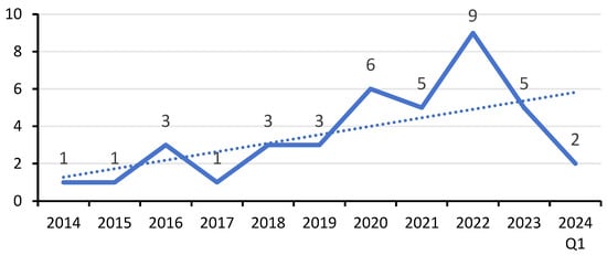 Figure 3 illustrates the annual evolution of published studies within the period under investigation. The mean year of publication is (2020.3 ± 2.6), indicating that this is an emerging field of research. The frequency of the publication year showed that most of the selected papers were published in 2023 (n = 9, 23.68%) studies, followed by 2020 (n = 6, 15.78%) studies, and 2021 and 2023 (n = 5, 13.15%) studies each. The data reveal a gradual increase in studies on this topic beginning around 2017.