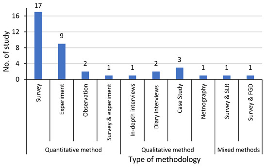 Figure 4 illustrates the distribution of methodologies utilized in the 38 selected papers. Most of the selected studies (n = 29, 76.31%) had adopted quantitative methods, applying a variety of data collection methods, including questionnaire survey (n = 17, 44.73%), experimental approaches (n = 9, 23.68%), observation study (n = 2, 5.26%), and mixed quantitative survey and experimental approaches (n = 1, 2.63%) study, see Figure 3 and Appendix A, Table A1. These were followed by seven qualitative studies (n = 7; 18.42%) that applied four main qualitative methods, including case study and interviews (n = 3, 7.89%), diary interviews (n = 2, 5.26%), netnography (n = 1, 2.63%), and in-depth expert interviews (n = 1, 2.63%) study. Two studies were mixed methods (n = 2; 5.26%) using a systematic review and questionnaire survey (n = 1, 2.63%) and online survey and focus group discussions (n = 1, 2.63%) study. Research strategy is critical in outlining the general approach researchers take to address their research questions.