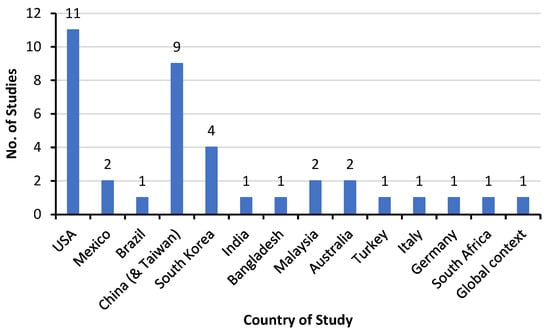 Figure 5 shows the distribution of the countries where the selected studies were conducted. Overall, the selected studies were conducted in (n = 13) countries around the world. Most of the selected studies have been done in the USA (n = 11, 28.94%) studies, followed by China (n = 9, 23.68%) studies, South Korea (n = 4, 10.52%) studies, Australia and Malaysia (n = 2, 5.26%) studies each, Mexico, Brazil, India, Bangladesh, Turkey, Italy, Germany, and South Africa (n = 1, 2.63%) study each. Besides, one of these studies was conducted in a global context, including Europe, America, Asia, and Australia (n = 1, 2.63%) study, see Figure 5.