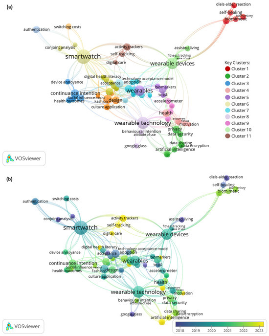 Therefore, from the analysis of the keyword co-occurrence network map (Figure 6), the key themes of this review included the following: (a) DWPs based on the keywords from Clusters 5, 6, and 10. (b) technical functions of DWPs as discussed in Clusters 1, 2, 7, and 10. (c) Consumer acceptance, as highlighted clearly in Clusters 3 and 7. (d) User behavior in the consumer acceptance model based on the keywords in Clusters 3 and 8. (e) Perceived outcomes of the consumer acceptance model in line with the keywords in Clusters 1 and 4. The keywords’ publication time in the overlay visualization showed that the trend research in the field focuses on biomimetic innovation of the digital wearables and bio wearables (sensors) and their health outcomes [28], see Figure 6b.