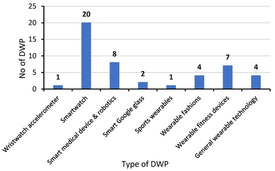 This section discusses the first theme of the “DWPs” and was discussed in all of the selected full-text papers (n = 38, 100%). These studies primarily investigate the functionality, technological challenges, usability, and consumer intention related to the DWPs. The analysis of the 38 studies identified eight (n = 8) types of DWPs, taking into account that some of the selected studies included more than one type of DWPs. The identified DWPs included smartwatch in (n = 20, 52.26%) studies [46,47,48,51,52,54,55,59,60,61,63,64,65,66,67,68,69,70,71,74], smart medical devices and robotics in (n = 8, 21.05%) studies, [28,30,31,49,58,76,77,78], wearable fitness devices in (n = 7, 18.42%) studies [48,66,67,68,73,74,76], wearable fashions [30,31,58,78] and general wearable technology [53,56,72,75] in (n = 4, 10.52%) studies each, smart glass in (n = 2, 5.26%) studies [62,67], and wristwatch accelerometer [50] and sports wearables [1] in (n = 1, 2.63%) study each. Smart medical devices and robotics include various types of products, such as wearable sensors and climbing robots [28], Scanadu Scout, iHealth-finger [30], wearable electrodes [31], wrist-worn devices (e.g., GeneActiv) [49], ActiGraph Insight Watch, ankle-worn activity monitor, Modus StepWatch [58], WIoMT, biosensors [76], motion sensors [77], strain sensors [78]. The mentioned examples of wearable fitness devices were Fitbit, Apple smartwatch [48], and fitness trackers [74]. Both smartwatches and wearable fitness devices were related to four categories of DWPs technical functions, including PU of wearable technology, PEOU of wearable technology, appearance and design, and security and privacy. Smartwatch was also highly connected with the acceptance model by (n = 12) codes and user behavior by (n = 13) codes (see Table 4). Wearable fitness devices were associated with the acceptance model and user behavior by (n = 6) codes each.