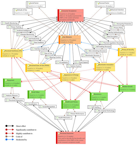 The first theme (DWPs) was described in eight codes related to the types of DWPs and their connections to the categories and codes of technical functions (second theme), consumer acceptance (third theme), and user behavior (fourth theme). The second theme (technical functions of DWPs) was described in four key categories and 20 codes. The four categories were wearable technology (including PU and PEOU), appearance and design, biomimetic innovation, and security and privacy. Biomimetic innovation is identified in the reviewed studies based on explicit descriptions of nature-inspired principles, structures, or functions, such as biomimetic designs, self-healing materials, skin-mimicking structures or surfaces, thermal regulation, or bio-inspired adaptive structures or systems. The data extracted from the selected studies are based on explicit mention of these terms related to bio-inspired terminology and functional or other design features that replicate biological properties. The third theme (consumer acceptance) was used to describe the concept of consumer acceptance in the DWPs context and their related factors in line with the second and fourth themes. The fourth theme (user behavior in the consumer acceptance model) was discussed in four key codes, including personal factor, social factor, attitude of use, and behavioral intention. It also addressed the relationship between the user behavior codes and the technical functions of DWPs in the consumer acceptance mode. The fifth theme (perceived outcomes of the consumer acceptance model) was described in five key categories and eight codes; the five categories included health and fitness, enjoyment, social value, biomimicry application, and market growth.
