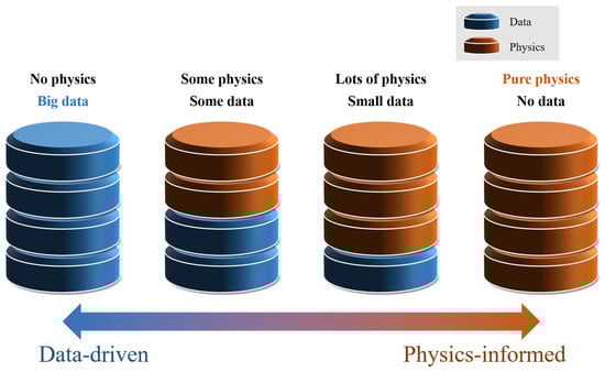 In 2019, Raissi et al. proposed the physics-informed neural network (PINN), which integrates physical laws and scientific knowledge into neural networks. This approach allows for effective learning and prediction even with a limited amount of data [7,8,9]. As shown in Figure 1, solution strategies for forward and inverse problems related to PDEs and engineering applications can be categorized into four groups. The right-hand side of the figure corresponds to methods involving PINNs, where numerical computation techniques such as the finite element method (FEM) or finite difference method (FDM) are used to generate synthetic data, and the PINN aims to minimize error based on such data [10,11].