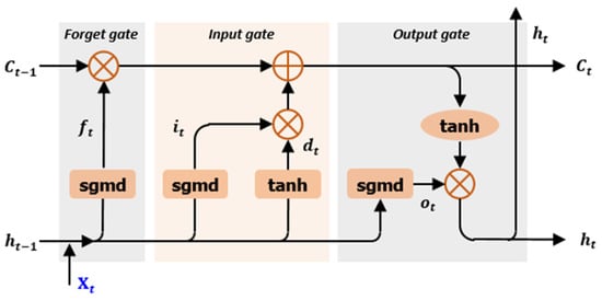 Recurrent neural networks (RNNs) are designed to process sequential data, making them well-suited for modeling time-series data such as structural component histories and response records in earthquake engineering. In particular, long short-term memory (LSTM) networks are capable of effectively learning complex temporal patterns and addressing the long-term dependency problem inherent in standard RNNs. The structure of an LSTM network is illustrated in Figure 2 [26,27]. The key innovation of LSTM lies in its two structural components: gates and a memory cell, which enable the network to manage long-term dependencies efficiently. Gates regulate the flow of information, while the memory cell stores or updates information over time, allowing for long-term memory retention. There are three primary types of gates—forget gate, input gate, and output gate—which interact to control and preserve the cell state [28,29]. The function of each gate is described below [30]: