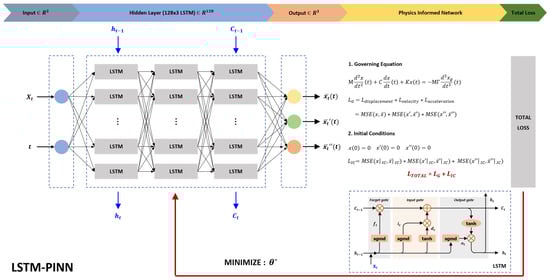 Through the loss function configuration described above, the LSTM-PINN model can simultaneously capture the temporal characteristics of time-series data and enforce compliance with physical laws. In particular, for the prediction of dynamic system behavior, considering both temporal dependencies and physical constraints allows the model to achieve high accuracy and physical consistency [34]. This structure is illustrated in Figure 3, which visually explains the components and information flow of LSTM-PINN.