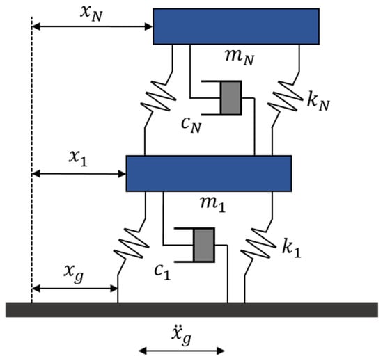 This study adopted two structural analysis models based on the framework proposed by Sadek et al. (1997) [35]. The first is a single-degree-of-freedom (SDOF) system and the second is a 10-story multi-degree-of-freedom (MDOF) system. The structural configuration used in this study is shown in Figure 4. The equations of motion for an N-story MDOF system subjected to seismic loads are expressed in Equation (11):