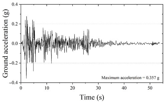 In addition, the predictive accuracy of each model over the entire time history was compared to analyze their respective advantages and limitations. The seismic input used for both the SDOF and MDOF structural models was the El-Centro North–South (NS) ground motion recorded in 1940, as shown in Figure 6. The El-Centro NS record has a total duration of 53.72 s and a peak ground acceleration (PGA) of 0.357 g.