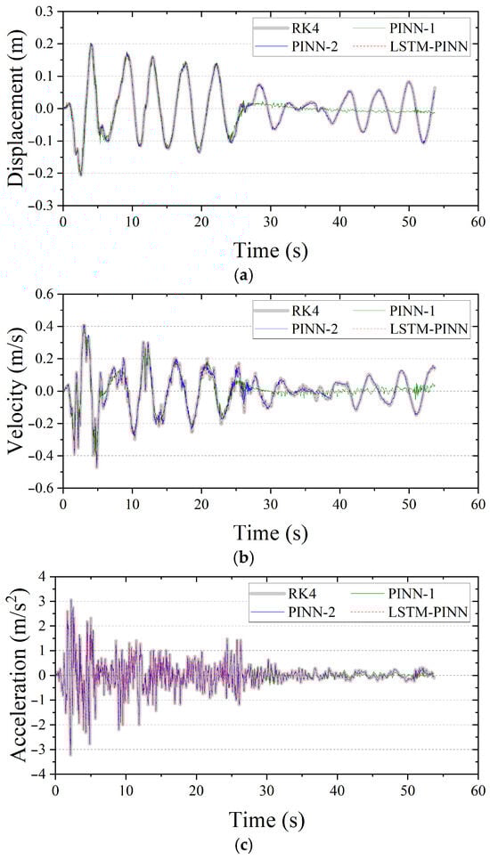 For the SDOF structure, the mass , damping coefficient , and stiffness were set to 1.0 ton, 2.0 kN/m, and 0.04 kN·s/m, respectively. Figure 7 presents the displacement, velocity, and acceleration responses predicted by RK4, PINN, and LSTM-PINN for the SDOF system. In Figure 7a, which shows the displacement response, PINN-1 produces results that closely match the RK4 solution up to approximately 25 s, but a noticeable phase shift emerges beyond that point. PINN-2, trained with a greater number of epochs, generally follows the RK4 solution well, although a minor phase difference is observed in the 30–40 s interval. In contrast, the LSTM-PINN demonstrates a high level of agreement with the RK4 results over the entire time duration, showing consistent accuracy in both phase and amplitude prediction. Figure 7b presents the velocity response. Again, PINN-1 performs reasonably well up to around 25 s, but its predictive accuracy rapidly deteriorates afterward. While PINN-2 yields velocity predictions that generally align with the RK4 results, discrepancies appear in intervals with rapidly changing velocities, particularly between 10 and 40 s. In comparison, the LSTM-PINN maintains strong consistency with the RK4 solution throughout the entire time domain. Finally, Figure 7c shows the acceleration response. All models—PINN-1, PINN-2, and LSTM-PINN—exhibit overall agreement with the RK4 results. This may be attributed to the fact that acceleration is explicitly defined as a linear combination of displacement and velocity, making it inherently more predictable. Additionally, since the acceleration term is directly included in the loss function, the models tend to converge toward accurate predictions early in training. However, PINN-1 shows a gradual divergence from the RK4 solution in the latter portion of the time domain.