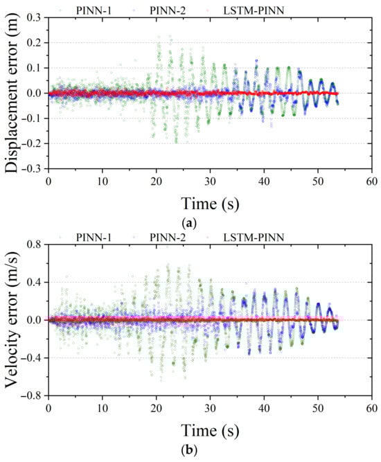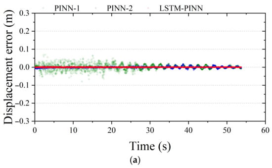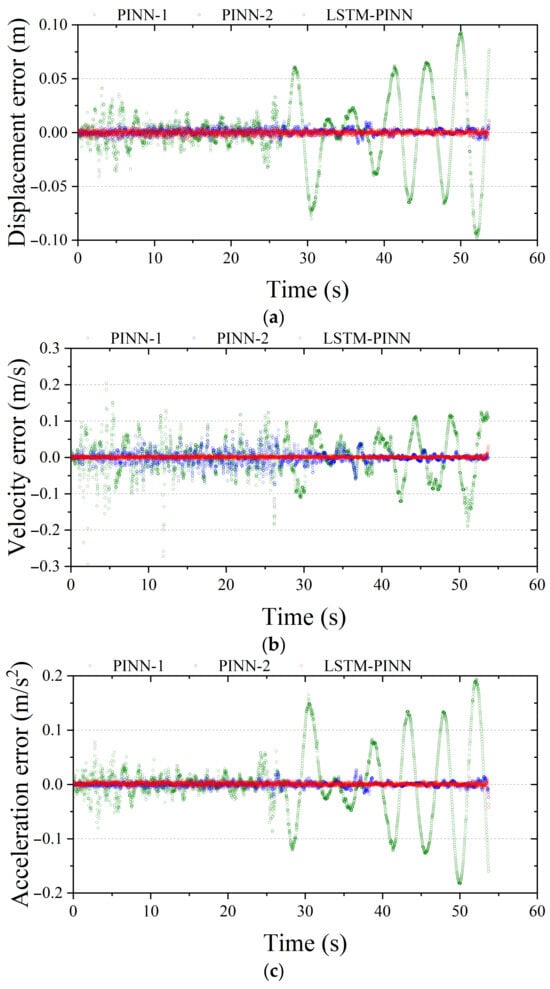Figure 11 and Figure 12 show the response errors for the first and tenth stories of the MDOF system, respectively. In all results presented in Figure 11, PINN-1 exhibits the largest error among the models. Notably, it shows relatively large errors during the initial vibration phase, which gradually stabilize over time. PINN-2, while showing reduced error compared to PINN-1, still demonstrates prominent errors in the early vibration period. In contrast, LSTM-PINN maintains the smallest error throughout the entire time domain, indicating the most stable performance among the three models. In Figure 12, the response becomes more complex due to higher structural dynamics, and the prediction error tends to increase accordingly, depending on the model’s capability. Both PINN-1 and PINN-2 show a trend of increasing error in the later stages of the vibration period. Meanwhile, LSTM-PINN consistently maintains the lowest error across the entire duration and delivers stable results across all response variables. These findings indicate that the LSTM-PINN achieves high reliability even in predicting higher-order responses, making it more suitable for complex structural systems with significant dynamic behaviors.
