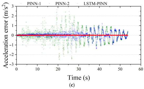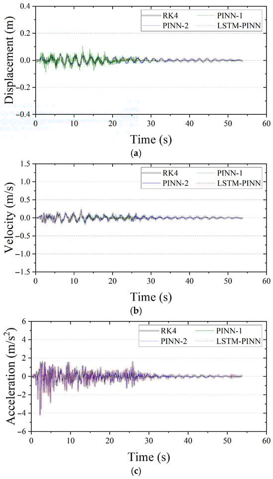 Figure 8 visualizes the time-series residuals between the predicted responses of each model and the RK4 reference solution. A residual value closer to zero indicates higher prediction accuracy. Among the three models, PINN-1 exhibits the largest overall error distribution across all physical quantities—displacement, velocity, and acceleration. In particular, after 25 s, significant phase shifts and accumulated amplitude deviations are observed. These discrepancies can be attributed to the accumulation of nonlinear prediction errors during long-term simulation and to limitations in the network’s ability to capture temporal dependencies. PINN-2, which was trained for more epochs, shows a generally reduced error magnitude compared to PINN-1 and maintains relatively stable performance. However, as seen in Figure 8b, temporary error spikes occur in periods of rapid ground motion variation—especially between 10 and 40 s—suggesting sensitivity to transient input fluctuations. In contrast, the LSTM-PINN demonstrates the narrowest and most uniform error distribution among the three models. It maintains a high level of agreement with the RK4 solution throughout the entire time domain without significant error accumulation. Notably, LSTM-PINN achieves this high accuracy with fewer training epochs, which can be attributed to the recurrent neural architecture’s ability to effectively learn temporal dependencies. Therefore, the LSTM-PINN model not only delivers high predictive accuracy but also exhibits superior training efficiency.