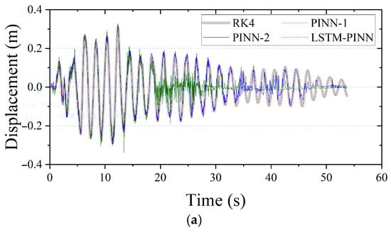 To evaluate the performance of the proposed LSTM-PINN model, we conducted a comparative analysis against the conventional PINN model under the same training conditions of 10,000 epochs. Additionally, to validate the robustness of the proposed method, another comparison was made using a PINN model trained for 50,000 epochs. The PINN models trained for 10,000 and 50,000 epochs are referred to as PINN-1 and PINN-2, respectively. The key training parameters used for each model are summarized in Table 2. To ensure a fair comparison among the three models (PINN-1, PINN-2, and LSTM-PINN), consistent initial training conditions were applied across all models. Specifically, we used the same learning rate (0.001), optimizer (Adam), activation function (tanh), and loss function structure that includes displacement, velocity, and acceleration terms. Although the number of training epochs varied across models, this variation was intentional and tailored to reflect the intrinsic characteristics and convergence behaviors of each model. In particular, the PINN-2 model was trained for a greater number of epochs as an experimental adjustment to compensate for the conventional PINN’s limited ability to capture time-dependent patterns. This measure ensured stable convergence and enabled a fair comparison among all models. To further avoid overfitting and entrapment in local minima, all models incorporated an exponential decay learning rate schedule and an early stopping condition based on the stagnation of validation loss. These strategies contributed to stable convergence and reliable performance across models.