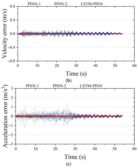Figure A4, Figure A5 and Figure A6 present the prediction errors in displacement, velocity, and acceleration responses for the second to ninth floors of the MDOF structure. In line with the findings reported in the main text, the LSTM-PINN model consistently exhibits the lowest prediction error across all intermediate floors and response variables.