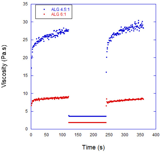 - High shear rate stage—The shear rate was significantly increased to around 100 s−1, disrupting the internal gel structure and temporarily lowering the viscosity for 120 s. This step simulates the behavior of the hydrogel during extrusion.