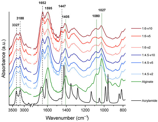 | Composition | UV Lamp Velocity | Ratio with CH2 Bending [1447 cm−1] of Polyacrylamide | ||