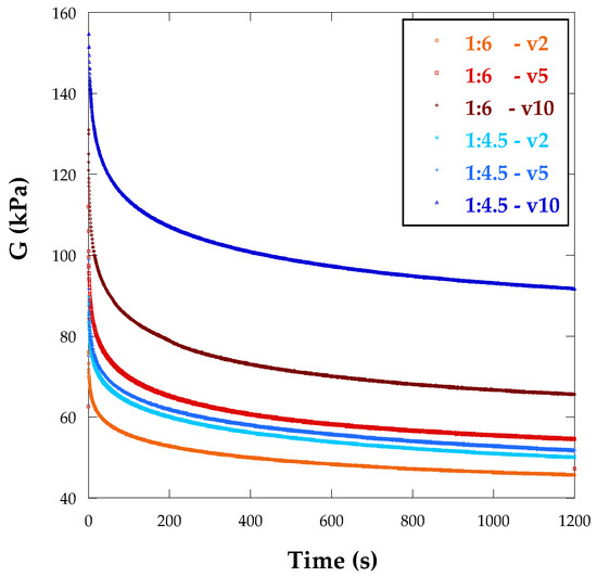 - Stage 2—A twist of 0.02 rad was applied, followed by a 1200 s relaxation period, with data being recorded every 0.2 s.