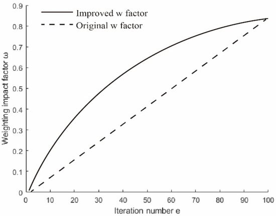 The values of 0.84 and are determined through extensive experiments. The traditional adaptive weight factor increases linearly, whereas the nonlinear weight factor employed here rises slowly in the early iterations, expanding the search range and thereby enhancing global exploration capability. In the later iterations, the increase rate of the weight factor accelerates, further strengthening the local exploitation capability. The variation in ω is illustrated in Figure 1.