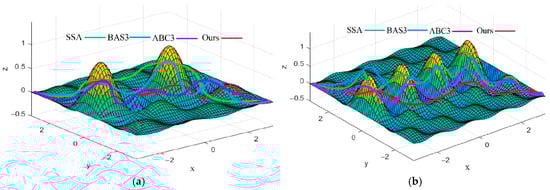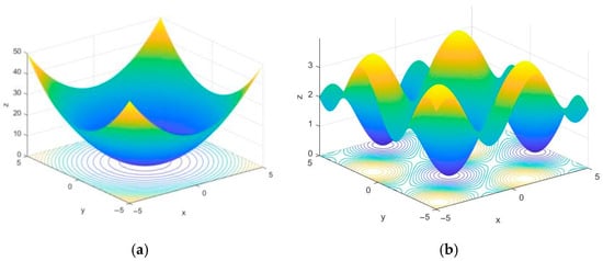 Benchmark functions with different dimensions and numbers of peaks are employed to verify the algorithms’ convergence speed and their ability to escape local optima. The selected benchmark functions [] are listed in Table 2, and part of the test function space is illustrated in Figure 3. The Sphere test function is a continuous unimodal convex function in a high-dimensional space with multiple local minima, enabling it to test the search algorithm’s ability to escape local minima. The Foxholes test function is a low-dimensional multimodal function with numerous canyons and obstacles, making the testing of algorithms more challenging.