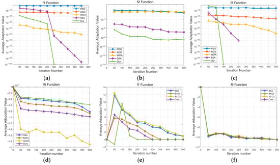 Comparison of benchmark function convergence curves. (a) Schwefel’s function; (b) Rosenbrock function; (c) Sphere function; (d) Schwefel function; (e) Foxholes function; (f) Schkel function.