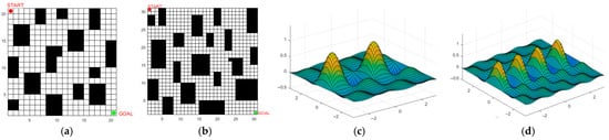 The IABCBAS algorithm is capable of rapidly generating a large number of waypoints, conducting optimal path searches, and enabling mobile platforms to avoid obstacles in the environment through path planning, thereby enhancing the operational efficiency and environmental adaptability of the platforms. Particularly in path planning for field environments such as military operations, this algorithm can give full play to the advantages of search algorithms in solving high-dimensional space problems; it efficiently explores the optimal solutions for path planning in three-dimensional space and optimizes the kinematic constraints and performance constraints of mobile platforms. Therefore, the IABCBAS algorithm holds high application value in addressing path planning problems across multiple engineering application fields. Two-dimensional fixed-area and three-dimensional simulation map models are established based on different obstacle distributions in various environments to verify the universality of the proposed method, as shown in Figure 5. For the 2D environment, a simple map (20 × 20) and a complex map (30 × 30) are constructed, where obstacles are represented by black grids and free spaces by white grids. For the 3D environment, simple bimodal and complex multimodal elevation maps are built using elevation data.