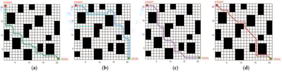 In Figure 5a,b, the top left corner of the map is the starting point of the path planning and the bottom right corner is the endpoint. The fence side length is set as B, the fence space is divided into rows and columns with B unit length. The n-th fence grid coordinates are , and the formula is shown in