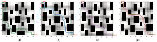 Optimal path planning results of four algorithms in a 2D complex environment: (a) SSA; (b) BAS3; (c) ACO3; (d) IABCBAS.