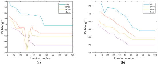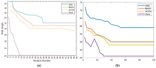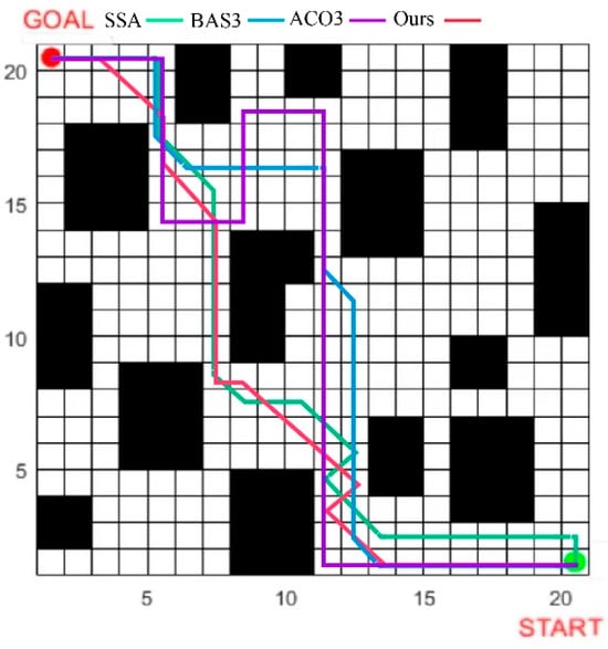 As observed in Figure 7 and Figure 9, for path planning in the 20 × 20 simple environment map, the SSA converges to the optimal solution at the 26th iteration, with an optimal path length of 32.4. However, the path contains numerous turns, which is unfavorable for the operation of unmanned vehicles in real environments. The BAS3 and ACO3 algorithms converge to the optimal solution successively at around the 18th and 17th iterations, with optimal path lengths of 29.8 and 26.4, respectively. Compared with the SSA, both exhibit fewer turns; however, their paths turn near obstacles, indicating weak space utilization capability. The proposed algorithm converges to the optimal solution at the ninth iteration, with a shorter planned path that is not affected by obstacles in space, thus achieving the best overall planning performance.