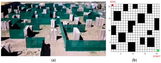 An experimental site was selected for the path planning test of the mobile platform— specifically, a real environment containing obstacles—and the site environment was modeled. The model was invoked according to experimental requirements, and the real site and its environment modeling results are presented in Figure 12. In Figure 12a, the white obstacles in the target vehicle test site are represented by black square grids in the model. Additionally, the partitions in the target vehicle test site correspond to the grid boundary lines in the modeled map shown in Figure 12b.