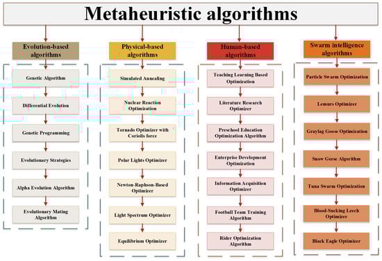 The Genetic Algorithm (GA) [] and Differential Evolution (DE) [] are designed based on the idea of evolution, including selection, mutation, and crossover, and we categorize them as EAs. Apart from these, there are some other algorithms based on evolutionary ideas, such as Genetic Programming (GP) [], Evolutionary Strategies (ESs) [], Alpha Evolution Algorithm (AEA) [], and Evolutionary Mating Algorithm (EMA) []. PAs include Simulated Annealing (SA) [], Nuclear Reaction Optimization (NRO) [], Tornado Optimizer with Coriolis force (TOC) [], Polar Lights Optimizer (PLO) [], Newton–Raphson-Based Optimizer (NRBO) [], Light Spectrum Optimizer (LSO) [], Equilibrium Optimizer (EO) [], Attraction–Repulsion Optimization Algorithm (AROA) [], Henry Gas Solubility Optimization (HGSO) [], Prism Refraction Search (PRS) [], and others. It has encompassed Teaching–Learning-Based Optimization (TLBO) [], Literature Research Optimizer (LRO) [], Preschool Education Optimization Algorithm (PEOA) [], Enterprise Development Optimization (EDO) [], Information Acquisition Optimizer (IAO) [], Football Team Training Algorithm (FTTA) [], Rider Optimization Algorithm (ROA) [], Escape Optimization Algorithm (EOA) [], Kids Learning Optimizer (KLO) [], Human Memory Optimization Algorithm (HMOA) [], and similar approaches. SIAs are one of the largest groups of metaheuristic algorithms. Algorithms such as Particle Swarm Optimization (PSO) [], Lemurs Optimizer (LO) [], Graylag Goose Optimization (GGO) [], Snow Geese Algorithm (SGA) [], Tuna Swarm Optimization (TSO) [], Blood-Sucking Leech Optimizer (BSLO) [], Black Eagle Optimizer (BEO) [], Elk Herd Optimizer (EHO) [], Sled Dog Optimizer (SDO) [], and Electric Eel Foraging Optimization (EEFO) [], which mimic the behaviors of various swarming groups in nature, are classified as SIAs. These four categories of metaheuristic algorithms are summarized in Figure 1.