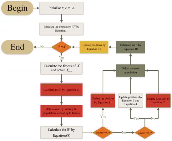 In today’s world, the difficulty of optimization problems is increasing with the rapid development of technology and the increasing complexity of engineering applications []. These complex problems usually have multiple local optimal solutions, high dimensionality, and complex coupling relationships, which bring unprecedented challenges to the traditional solution methods []. To cope with these difficulties, optimization algorithms have become a hot research topic. Optimization algorithms are mainly divided into two categories: deterministic algorithms and nondeterministic algorithms []. Deterministic algorithms generate consistent outputs with the same inputs, and they rely on a rigorous computational process to find exact solutions []. However, such algorithms often take too long to run due to excessive computation when dealing with large-scale data. In addition, when faced with complex and variable high-dimensional problems, deterministic algorithms are prone to fall into local optimal solutions and exhibit low adaptability. In contrast, metaheuristic algorithms among the nondeterministic algorithms stand out with their unique advantages. Metaheuristic algorithms do not rely on the derivative information of the problem and are able to find approximate optimal solutions quickly in complex and variable environments []. Such algorithms are widely adopted in several fields, such as task planning [,,], image processing [,,], parameter tuning [,,], feature selection [,,], energy management [,,], biomedical detection [,,], electronic monitoring systems [,], model calibration [,], etc.