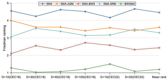 The results of the Friedman test based on the results of ablation experiments are shown in Table 1, where “Mean rank” indicates the average ranking and “Overall rank” indicates the ordering, and the rankings of each algorithm in different dimensions are visualized in Figure 3. Based on the Friedman p-values in Table 1, it is clear that there is a significant difference between the BWSMA, SMA-AGM, SMA-BWS, SMA-SRM, and basic SMA, which are significantly different from each other. Specifically, the BWSMA ranked first on all six cases, achieving an average ranking of 1.195. The three SMA variants also ranked above the basic SMA, with rankings of 3.609, 2.434, and 3.301, respectively. These results provide a preliminary indication of the effectiveness and compatibility of the three improved strategies.
