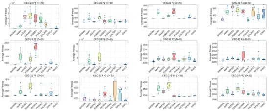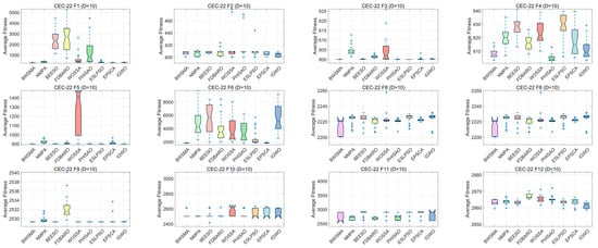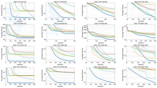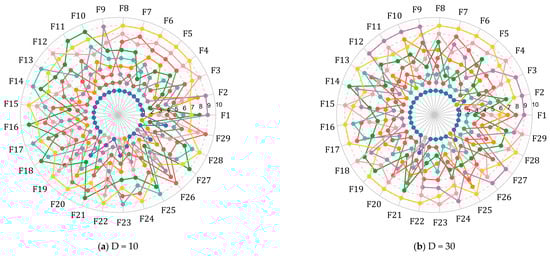 The IEEE CEC2018 test suite and the IEEE CEC2022 test suite are two popular public test suites that are widely used. The CEC2018 test suite contains 29 different classes of functions. The CEC2022 test suite contains 12 functions with different characteristics. These functions include unimodal, multimodal, hybrid, and composite functions that check the local search, global exploration, and ability of an algorithm to jump out of a local optimum. More information about the CEC2018 test suite and the CEC2022 test suite can be found in Table A1 and Table A2 in Appendix A. In the experiments of this paper, the dimensions of the CEC2018 test suite are set to 10, 30, 50, and 100. The dimensions of the CEC2022 test suite are set to 10 and 20. The population size of each algorithm is set to 50, and the maximum number of iterations is set to 300. Since metaheuristic algorithms belong to the category of stochastic algorithms, in order to circumvent the evaluation discrepancy caused by the randomness, all the experiments of this paper are required to be conducted 30 times. In addition, the Friedman test, Wilcoxon rank-sum test, and Nemenyi post hoc test are used to analyze the experimental data comprehensively. The Friedman test is used for overall comparison, which can examine the overall differences between the compared algorithms. The Wilcoxon rank-sum test is used for two-by-two comparisons and can examine whether there is a difference between two algorithms or not. The Nemenyi post hoc test is based on the Friedman test and can quantify the magnitude of the difference between different algorithms. It should be noted that all statistical tests were performed at a significance level of 0.05.