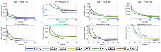 This paper proposes three improvement techniques to enhance the performance of the basic SMA. In order to analyze the impact of different improvement strategies on the BWSMA, the ablation experiments are performed in this section. Based on the three improvement strategies, we propose SMA-AGM, SMA-BWS, and SMA-SRM, which combine the adaptive greedy mechanism, best–worst management strategy, and stagnant replacement mechanism, respectively. By comparing the results of SMA-AGM, SMA-BWS, SMA-SRM, the SMA, and the BWSMA on the CEC2018 and CEC2022 test suites, we can demonstrate that these three mechanisms are effective in improving the performance of the mbasic SMA.