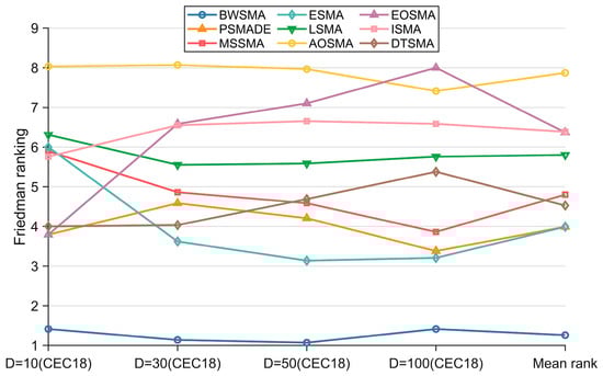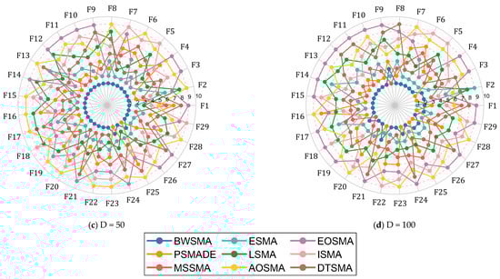 In this subsection, we compare the BWSMA with eight SMA variants to illustrate the superiority of the proposed algorithm in this paper. These variants include PSMADE, MSSMA, ESMA, LSMA, AOSMA, EOSMA, ISMA, and DTSMA. Table 3 shows the specific parameters of these selected comparison algorithms. The best values, standard deviations, average values, and rankings obtained by the BWSMA and the eight SMA variants on the CEC2018 test suite are summarized in Table A9, Table A10, Table A11 and Table A12 in Appendix A. The rankings of the BWSMA and SMA variants on each function under the four dimensions are directly depicted in Figure 5. Within Figure 5, the rankings of each algorithm on the different functions enclose a surface, and the smaller the surface area, the better the performance of the algorithm. According to Figure 5, BWSMA has the smallest surface, which means that the overall performance of BWSMA is better than other SMA variants.