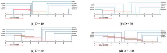 Table 4 summarizes the results of the Wilcoxon rank-sum test between the BWSMA and SMA variants, where the symbols “+/=/−” indicate that the BWSMA is superior/similar/inferior to other SMA variants on the CEC2018 test set. According to Table 4, the BWSMA has a clear advantage, with significantly more “+” than “−” and even more than the total number of “−” and “=”. This indicates that the BWSMA has a clear dominance over other SMA variants on the CEC2018 test set. Table 5 presents the Friedman test results for the BWSMA and SMA variants, whose rankings are visualized in Figure 6. Based on the results of Friedman’s test for BWSMA and SMA variants, the BWSMA ranked first among all the algorithms, achieving an average ranking of 1.259. PSMADE and ESMA tied for second place. Overall, there is a significant difference between the BWSMA and the other SMA variants, which is derived from a p-value of less than 0.05. To further quantify the magnitude of the difference between the BWSMA and SMA variants, Nemenyi post hoc tests were performed. In the Nemenyi post hoc test, the critical difference value (CDV) can be calculated based on the number of functions and the number of algorithms []. The Nemenyi test assumes that two algorithms with similar performance will be connected by line segments of length CDV and that algorithms with significant gaps will not be connected by line segments between them. Figure 7 visualizes the size of the difference between the BWSMA and SMA variants. As shown in Figure 7, there are significant differences between the BWSMA and MSSMA, ESMA, LSMA, AOSMA, EOSMA, ISMA, and DTSMA on the 10D, 30D, and 50D CEC2018 test sets. On 100D, there is no significant difference between the performance of the BWSMA and PSMADE or ESMA, but it is significantly better than the MSSMA, LSMA, AOSMA, EOSMA, ISMA, and DTSMA.