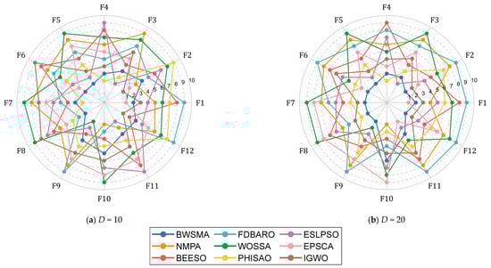 Algorithm performance-sorting radar chart of BWSMA and SMA variants.