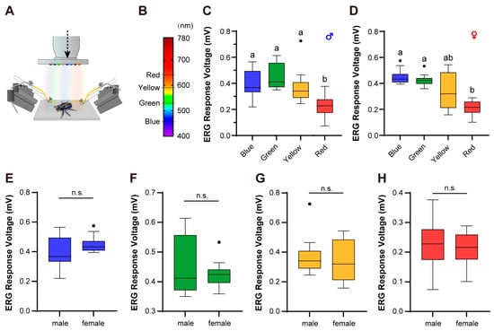 The electrophysiological responses of E. florensis compound eyes. (A) ERG equipment. (B) The spectral distribution of the test light source. (C,D) The quantification of the ERG voltage responses of male (C) and female (D) E. florensis. Different letters above the bars indicate a significant difference between ERG responses at the 0.05 level. (E–H) The quantification of the ERG voltage responses stimulated by blue (E), green (F), yellow (G), and red (H) light. n.s. indicates no significant difference between male and female individuals (p > 0.05).
