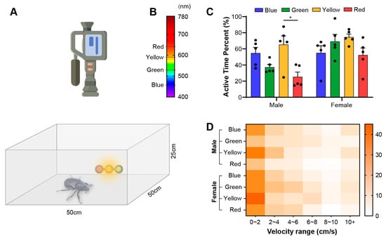 In terms of overall activity, females exhibited slightly higher activity level than males, particularly under green and red light, where females spent more time active than males. However, under blue and yellow light, both sexes showed similar levels of activity. We propose that positive and negative phototaxis drive insect movement, which is likely physiological in nature, although the exact mechanism remains to be explored. When confronted with green or red light, which the beetles neither prefer nor can perceive, their movement is less driven, and the proportion of time spent active reflects their intrinsic activity levels.