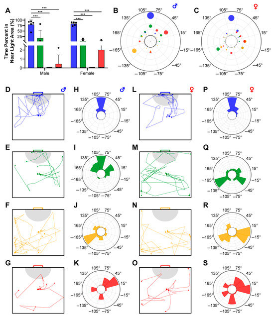 We define the semicircular area with a radius of 12.5 cm from the center of the light source as the near-light area (NLA, as illustrated by the gray regions in Figure 3D–G,L–O) and record the duration of time individuals spend within this area as a criteria for assessing their phototactic behavior. Figure 3A demonstrates that both female and male E. florensis exhibit higher proportions of NLA residence time under blue light compared to green, yellow, and red light attractions, with extremely significant differences (p < 0.001). Under green and red light attractions, some individuals move toward or remain in the NLA, whereas under yellow light, no individuals enter the NLA at all. There are no significant differences in NLA residence time between male and female individuals under green, yellow, and red light (p > 0.05).