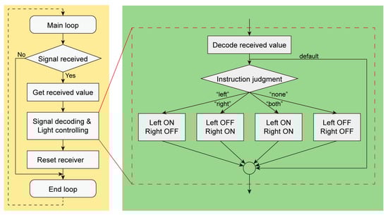 According to the results of behavioral experiments, we determined that female E. florensis exhibit slightly higher activity levels compared to males; thus, we utilized females as the carriers for the electronic backpack in our insect–machine hybrid system (Figure 4C,D). The working logic of the electronic backpack is shown in Figure 5. We conducted steering control tests with eleven female adults. The results indicated that the blue LEDs could induce E. florensis to carry out same-direction turning (Video S1). After activating the attraction light sources on the electronic backpack, the body axes of the tested individuals deflected by 62.34° and 58.35° to the left and right sides, respectively, within 5 s (Figure 4F). Before activating the light sources, the average turning angular velocities of the left-turn and right-turn test groups were 0.70° ± 2.32° and 1.79° ± 1.31° (AVE ± SE), respectively, with no significant difference (p > 0.05). The average turning angle was 12.47° ± 2.63° after activating the left light source, which was significantly higher than before turning on the light (p < 0.01). The angular velocity for right-turn control was −11.67° ± 1.35°, showing a extremely significant difference compared to before turning on the light (p < 0.001) (Figure 4G).