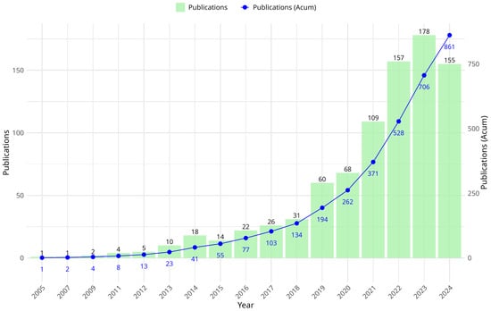 During the initial years of the analyzed period (2005–2012), the number of publications was low, with values below 20 documents per year. Starting in 2013, a progressive increase in scientific production is observed, with the cumulative number of documents showing an upward trend and exponential growth behavior.