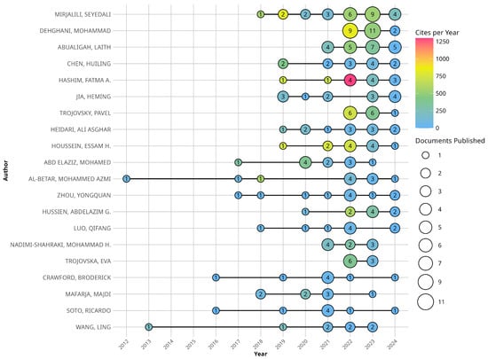 The analysis of the temporal distribution of scientific production reveals that some authors began contributing to the field more recently, while others have maintained a more extensive publication trajectory. For instance, authors such as Mirjalili, Seyedali, and Dehghani, Mohammad exhibit a sustained high level of productivity in recent years, with significant peaks in the number of publications.