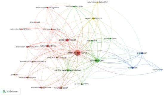 - Co-occurrence Network: To visualize the thematic structure of the literature on the exploration–exploitation balance in metaheuristics, a keyword co-occurrence map was constructed using VOSviewer (version 1.6.20). This analysis was based on the following methodological criteria:Term Normalization: A specialized thesaurus list was applied to group synonymous or conceptually equivalent terms, reducing semantic redundancy and ensuring interpretative coherence of the clusters. For example: