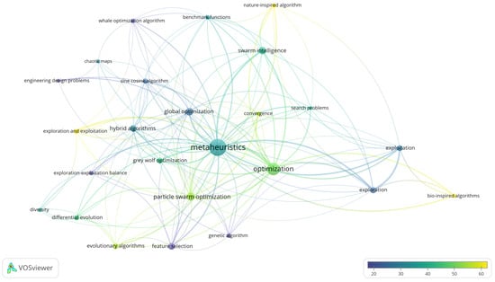 To analyze the thematic structure and relative impact of the scientific literature on the exploration–exploitation balance in metaheuristics, a keyword co-occurrence analysis was conducted using author keywords in VOSviewer (version 1.6.20). The analysis was performed on the refined dataset with minimum occurrence (≥18) and association strength (≥2.0) thresholds, including term normalization processes to ensure semantic consistency. The resulting visualization (Figure 4), composed of 25 nodes distributed across four clusters, reflects the semantic and conceptual grouping of terms based on their co-occurrence in the analyzed literature. Each node represents a keyword, and its size corresponds to the term’s frequency of occurrence. The links between nodes indicate how often two terms appear together in the same documents, reflecting thematic cohesion, while the thickness of the links represents the strength of association between terms.