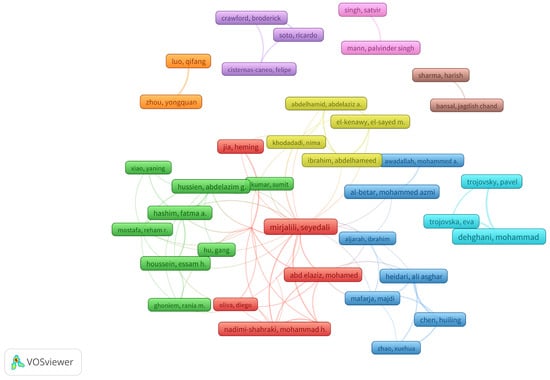 The red cluster stands out as the central core of the network, with Seyedali Mirjalili as the most connected node, establishing links with various researchers, including Abd Elaziz, Mohamed, Oliva, Diego, Nadimi-Shahraki, Mohammad H., and Jia, Heming. This group is densely interconnected, evidencing a consolidated community with a high collaboration frequency.
