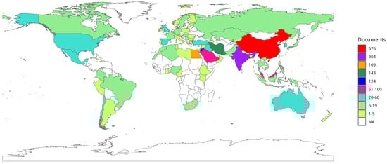 The analysis reveals a predominance of Asia in terms of publication volume. China (red, 676 documents) and India (purple, 304 documents) stand out as the countries with the highest presence in institutional affiliations within the analysed corpus. Egypt (orange, 169 documents), Iran (dark green, 143 documents), and Jordan (blue, 124 documents) complete the group of nations with the highest number of documents counted based on their researchers’ affiliations.