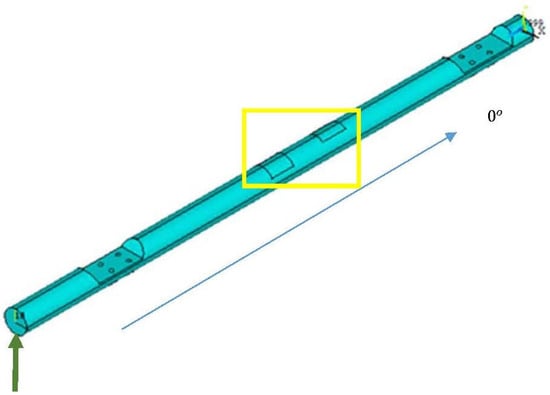 The load applied is a static resultant force F, which represents a force (Favg) in the vertical direction (z-axis), corresponding to thrust or impact force, and a force representing the tail aerodynamic effect (FR2) applied at a 30° angle to the vertical direction. The force is shown in Figure 1, as well as the parameterized model and the setup of FEA conditions. Contour conditions (constraints) are marked in yellow. The main direction of the layers is set at 0° relative to the longitudinal axis of the beam.