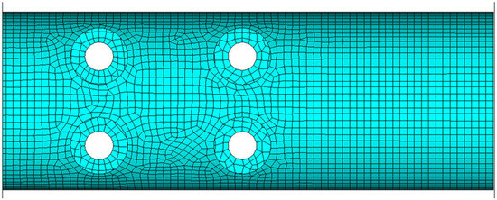 Following the mesh convergence study, an element size of approximately 4 mm was adopted, resulting in a model with 10,975 nodes and 21,452 finite elements. A segment of this mesh is shown in Figure 3. The mechanical properties of the materials (corresponding to carbon plies) used in the beam FE simulations are provided in Table 1.