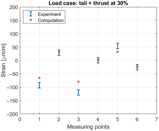To additionally validate the numerical model that forms the basis for the subsequent predictive tool based on ANNs, a simple static test was performed. Since all the details of the experimental setup and measuring equipment can be found in [22], here, just one load case will be presented. Figure 4 illustrates the correspondence between measured and computed strains at six locations distributed along the beam. It can be observed that the trend of the structural response to static loading is completely captured by the numerical model. Slight deviations in the absolute values can be attributed to the faults in the material, errors during the production process, and strain gauge sensitivity. The numerical model simulates ideal manufacturing conditions, which are never fully attainable in practice. Nevertheless, the observed trend of agreement between numerical and experimental results confirms the robustness and accuracy of the model, providing a reliable foundation for the development of a predictive tool based on artificial neural networks. Additionally, the model demonstrates the capability to accurately replicate the physical behavior of slender laminated structures under quasi-static loading.