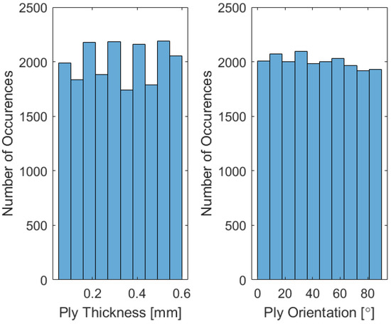 The input dataset is generated through a substantial number of structural simulations (20,000 repeated calculations) conducted on randomly generated configurations, representing potential solutions. Given that the starting structural model is based on the 14 mentioned independent input and 6 output parameters, this set size was determined as sufficient after trial and error. Here, the 14 input parameters, including ply thicknesses, ply orientations, and hole diameters, are nearly uniformly distributed within the design space to ensure sufficient data variability and generality (as can be seen in the histogram in Figure 5), but different choices can be made for different structures and materials.